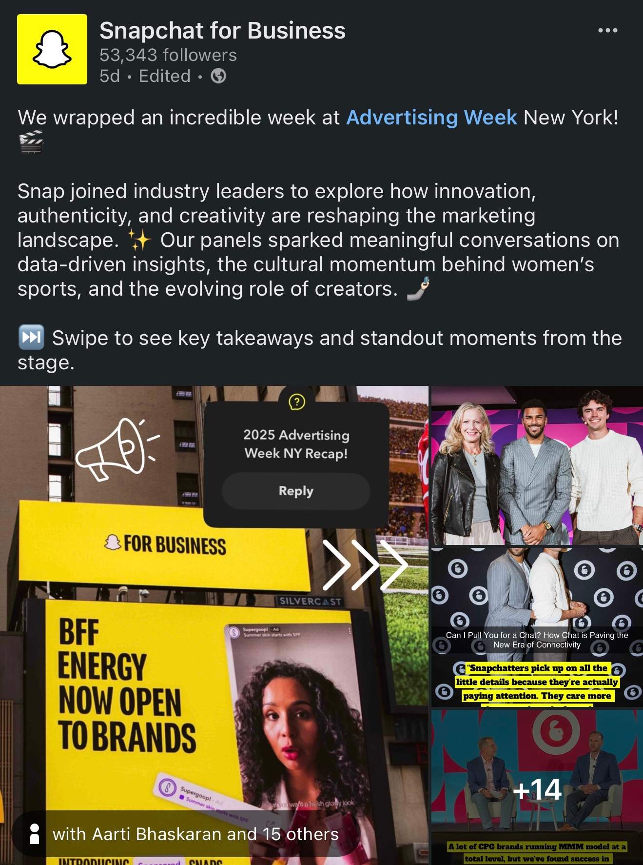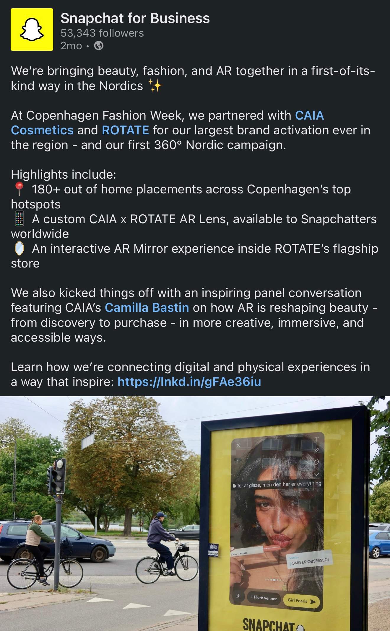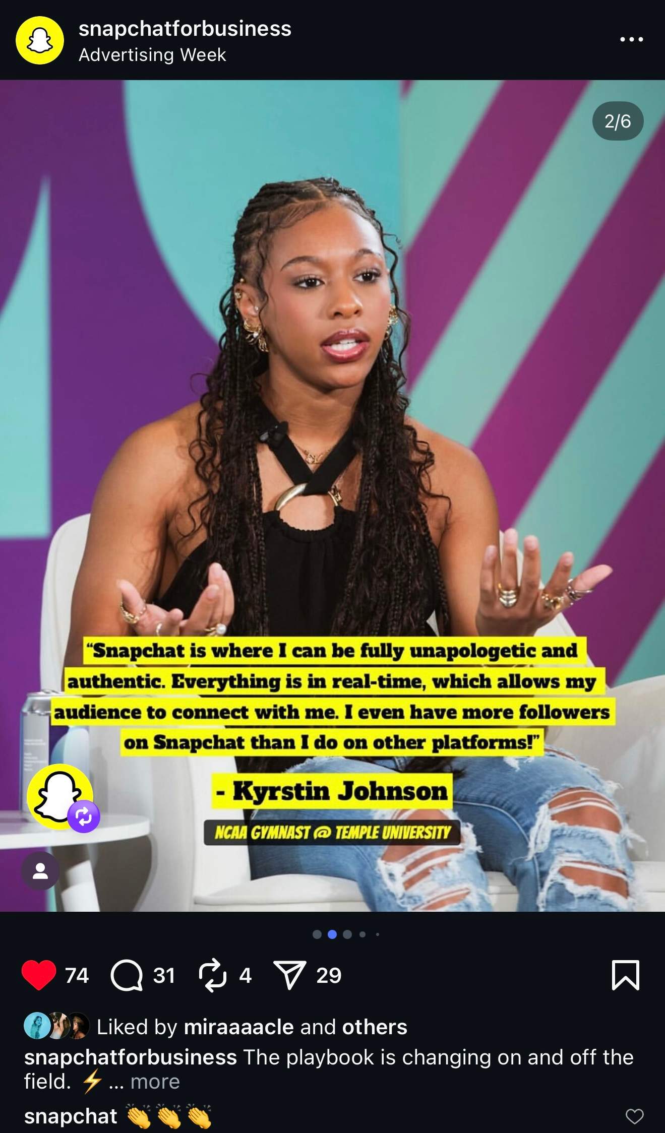 Launched Snap for Business’ first Instagram account, developing its strategy, voice, and creative direction to expand reach to 2M in first 30 days.
